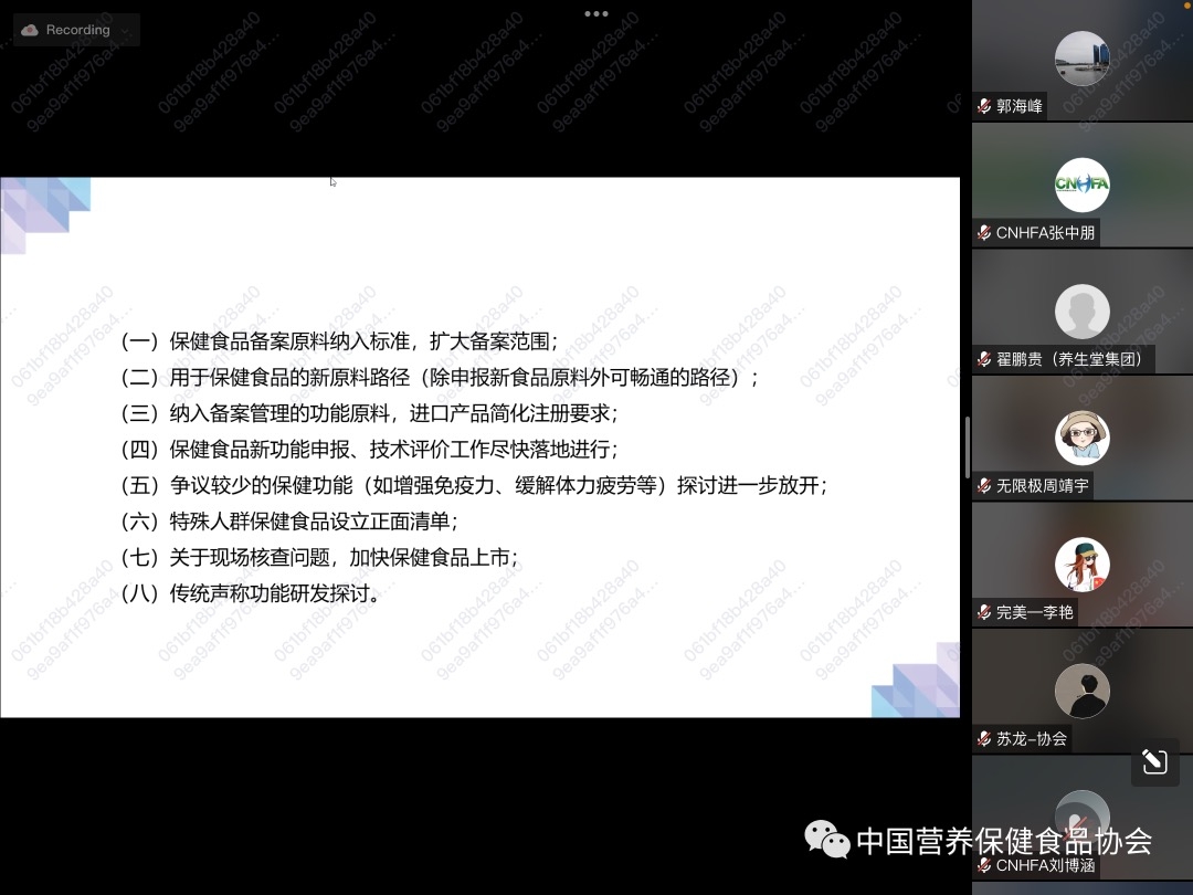 會議還邀請了雀巢、拜耳、赫力昂、湯臣倍健、安利、健合、康寶萊、珍奧、養(yǎng)生堂、無限極、仙樂健康、完美12家保健食品企業(yè)代表參會。會上企業(yè)代表們紛紛發(fā)言,就擴(kuò)大保健食品備案范圍、新原料及新功能申報(bào)、特殊人群正面清單、現(xiàn)場核查、傳統(tǒng)功能聲稱等方面進(jìn)行了討論并提出了意見建議。