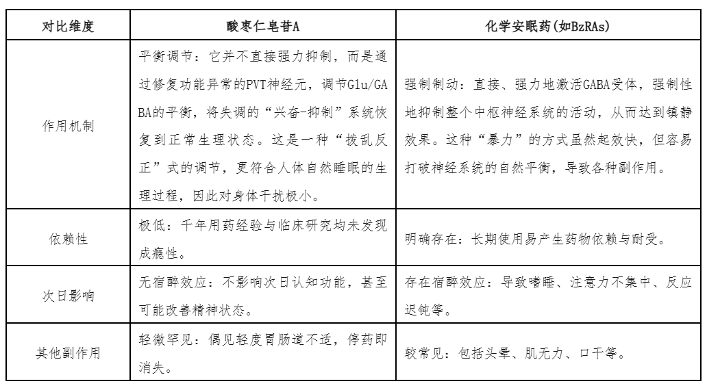 與化學安眠藥相比,酸棗仁皂苷A在作用機制與安全性上展現(xiàn)出根本性差異,完美契合現(xiàn)代消費者“安全優(yōu)先”的需求,其“精準調節(jié)+低毒無依賴”的特性,正重新定義助眠方案的核心標準,具體對比如下: