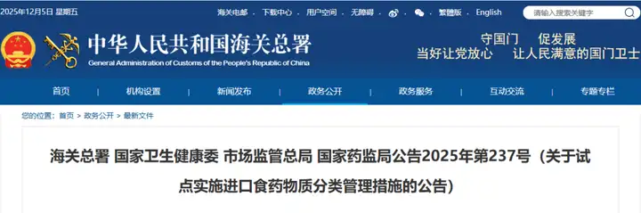 2025年12月3日,海關(guān)總署、國家衛(wèi)生健康委、市場監(jiān)管總局、國家藥監(jiān)局聯(lián)合發(fā)布第237號(hào)公告,對(duì)30種食藥物質(zhì)試點(diǎn)實(shí)施進(jìn)口分類管理。這是首次在國家層面建立食藥物質(zhì)"按用途分類監(jiān)管"機(jī)制,借鑒了自貿(mào)試驗(yàn)區(qū)先行先試經(jīng)驗(yàn),標(biāo)志著我國特殊商品監(jiān)管從"一刀切"向"精準(zhǔn)化"轉(zhuǎn)變。