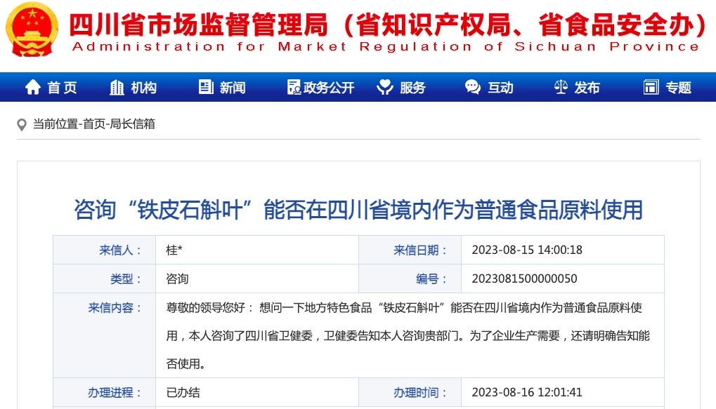 2021年,《四川省開展天麻、鐵皮石斛、靈芝按照傳統(tǒng)既是食品又是中藥材的物質管理試點方案》經省政府同意,并報國家衛(wèi)生健康委、國家市場監(jiān)管總局核定,決定在四川省內開展為期一年的天麻、鐵皮石斛、靈芝三種物質按照傳統(tǒng)既是食品又是中藥材的物質管理試點工作。產品范圍:在全省行政區(qū)域內(包括省外種植基地)種植以天麻、鐵皮石斛、靈芝為原材料,按照傳統(tǒng)生產工藝或飲食習慣食用加工的普通食品,不包括化學提取物產品(如含某種物質提取素的藥品、保健食品)。試點產品須按“食品生產許可分類目錄”取得相關品種生產許可后方可從事生產加工。目前試點工作已結束。經查詢,鐵皮石斛葉已終止審查,衛(wèi)生行政部門建議按照《食品安全法》第29條管理。