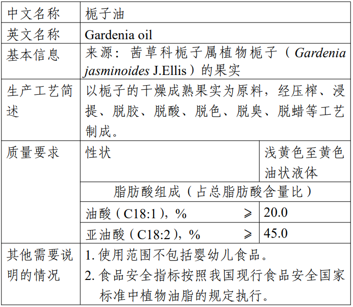 1. 解讀資料。梔子油是以茜草科梔子屬植物梔子(Gardenia jasminoidesJ.Ellis)的干燥成熟果實(shí)為原料,經(jīng)壓榨、浸提、脫膠、脫酸、脫色、脫臭、脫蠟等工藝制成。梔子原產(chǎn)于我國(guó),在我國(guó)江西、河南、福建等地區(qū)廣泛種植。梔子油富含不飽和脂肪酸(含量≥65%),主要包括亞油酸和油酸等,且含有少量的蛋白質(zhì)、維生素、礦物質(zhì)和角鯊烯等活性成分。從風(fēng)險(xiǎn)預(yù)防原則考慮,本產(chǎn)品使用范圍不包括嬰幼兒食品。該原料的食品安全指標(biāo)按照我國(guó)現(xiàn)行食品安全國(guó)家標(biāo)準(zhǔn)中植物油脂的規(guī)定執(zhí)行。