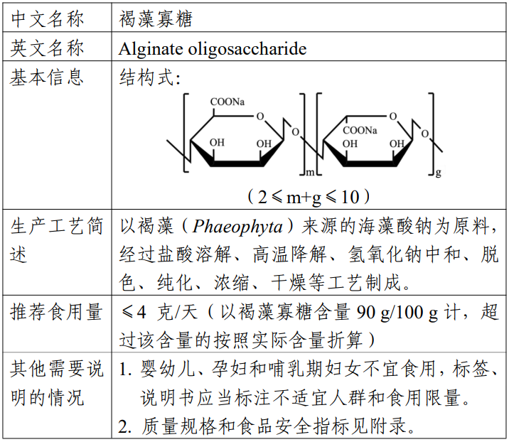 1.解讀材料。褐藻寡糖是以褐藻(Phaeophyta)來(lái)源的海藻酸鈉為原料,經(jīng)過(guò)鹽酸溶解、高溫降解、氫氧化鈉中和、脫色、純化、濃縮、干燥等工藝制成。褐藻寡糖是由β-D-甘露糖醛酸鈉和α-L-古羅糖醛酸鈉經(jīng)1,4-糖苷鍵交替連接形成的聚合度為2~10的一種低聚糖。本產(chǎn)品推薦食用量≤4 克/天(以褐藻寡糖含量90g/100g計(jì),超過(guò)該含量的按照實(shí)際含量折算)。鑒于褐藻寡糖在嬰幼兒、孕婦和哺乳期婦女人群中的食用安全性資料不足,從風(fēng)險(xiǎn)預(yù)防原則考慮,上述人群不宜食用。該原料的食品安全指標(biāo)按照公告規(guī)定執(zhí)行。日本批準(zhǔn)褐藻寡糖作為特定保健用食品;我國(guó)臺(tái)灣地區(qū)已將其作為食品原料使用。