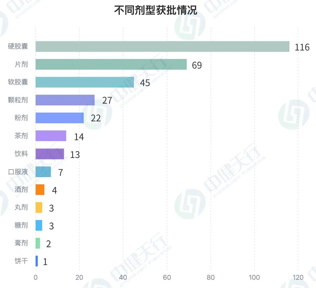 新獲批的保健食品在劑型上呈現(xiàn)出多樣性,包括硬膠囊、片劑、軟膠囊、粉劑、顆粒劑、口服液等,涵蓋了絕大部分劑型。根據(jù)匯總數(shù)據(jù)顯示,其中硬膠囊在新批準(zhǔn)保健食品中獲批數(shù)量最多,共計(jì)116款,片劑獲批數(shù)量69款,軟膠囊獲批數(shù)量為45款。
