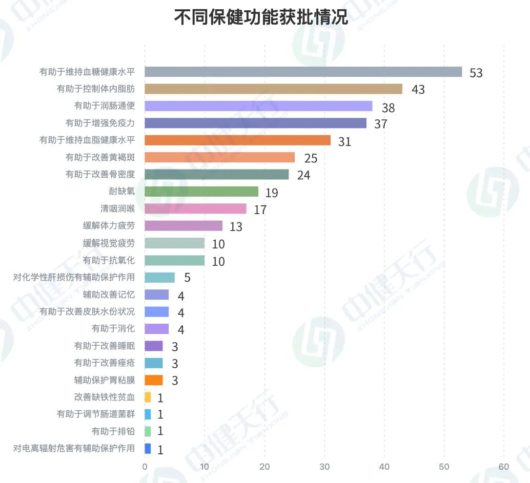 在獲批的325款保健食品中,有助于維持血糖健康水平功能的產(chǎn)品獲批53款,處于領(lǐng)先,其次是有助于控制體內(nèi)脂肪和有助于潤腸通便分別獲批43款和38款。