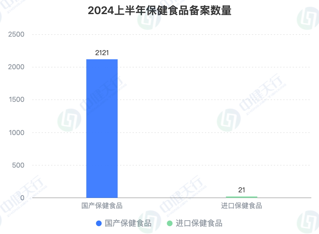 根據(jù)國(guó)家市場(chǎng)監(jiān)督管理總局食品審評(píng)中心及各省、市、自治區(qū)市場(chǎng)監(jiān)督管理局官方網(wǎng)站公開(kāi)發(fā)布保健食品備案產(chǎn)品信息,2024年上半年(截至目前)共有2142款保健食品獲得備案憑證,其中,2121款為國(guó)產(chǎn)保健食品,21款為進(jìn)口保健食品。
