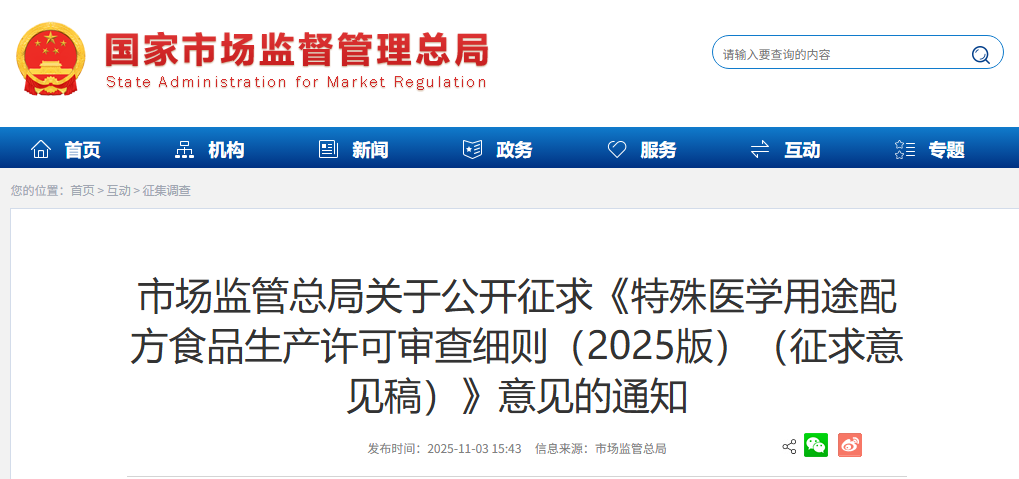 依據(jù)《食品安全法》及其實施條例、《食品生產(chǎn)許可管理辦法》等法律法規(guī)規(guī)章和特殊醫(yī)學(xué)用途配方食品的食品安全國家標(biāo)準(zhǔn),市場監(jiān)管總局組織修訂了《特殊醫(yī)學(xué)用途配方食品生產(chǎn)許可審查細(xì)則(2025版)(征求意見稿)》,現(xiàn)向社會公開征求意見。歡迎各有關(guān)單位和個人提出修改意見,并于2025年12月3日前反饋市場監(jiān)管總局。公眾可通過以下途徑和方式提出意見: