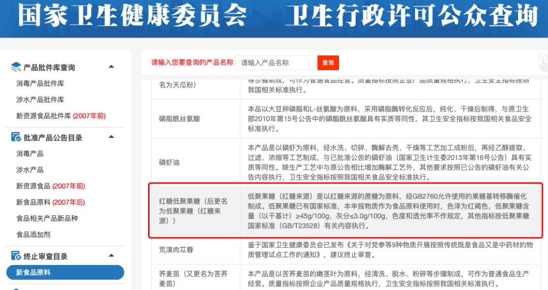 | 紅糖低聚果糖(后更名為低聚果糖(紅糖來源)) | 低聚果糖(紅糖來源)是以紅糖來源的蔗糖為原料,經GB2760允許使用的果糖基轉移酶催化制成。低聚果糖已有國家標準,本申報物質作為食品原料使用時,色澤為紅褐色,低聚果糖含量(以干基計)≥45g/100g,灰分≤3.0g/100g,色度和透光率不作規(guī)定,其他指標按低聚果糖國家標準(GB/T23528)有關內容執(zhí)行。 |
